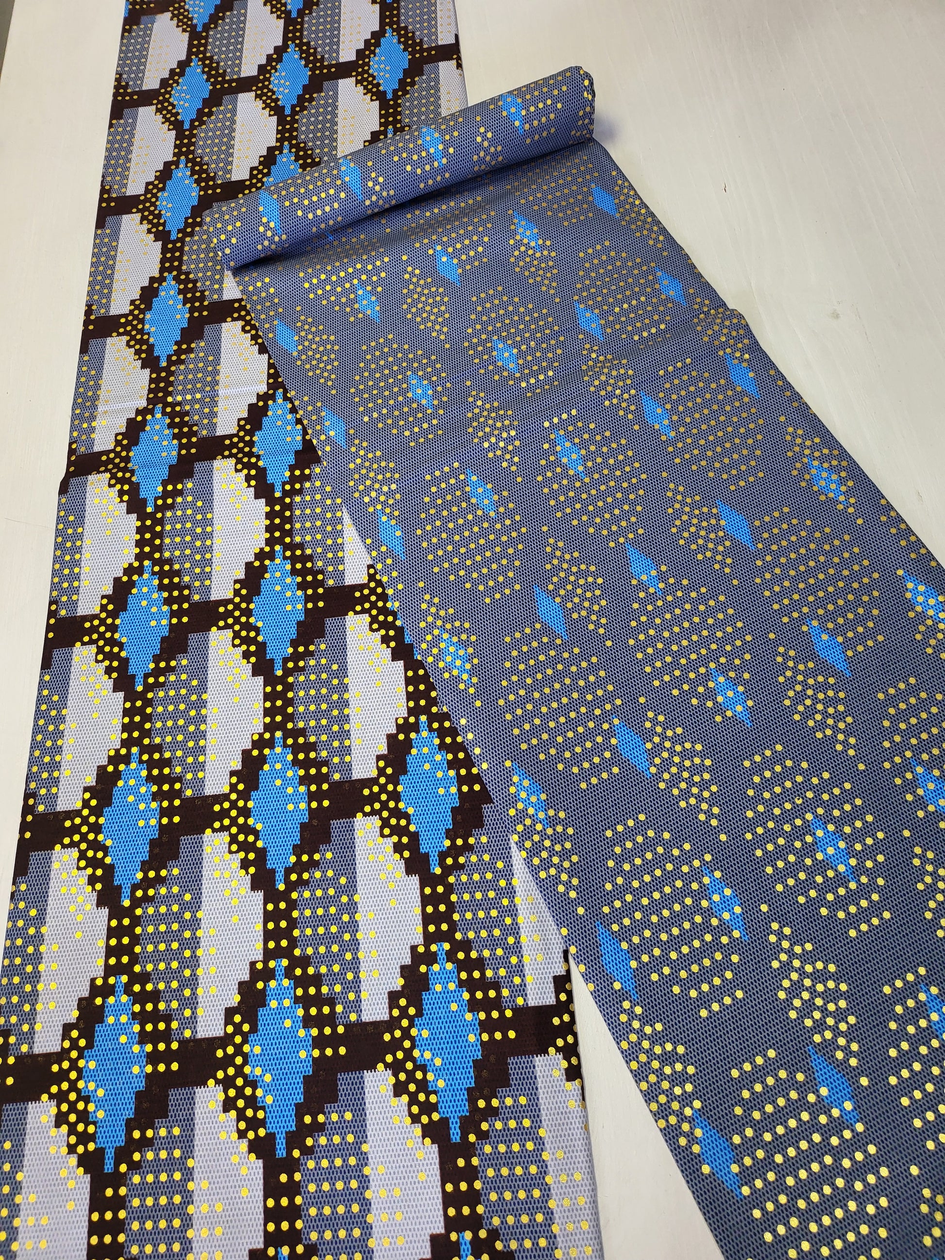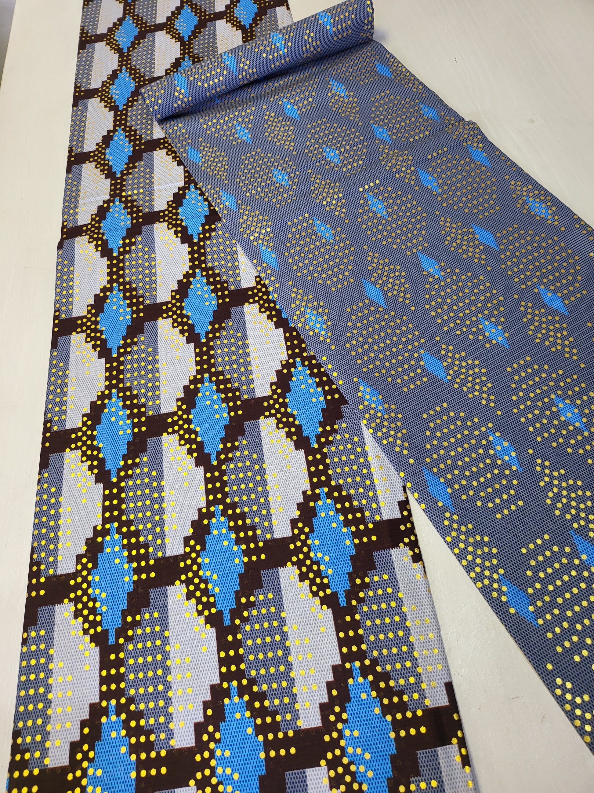• 6 yards (4 yards kente pattern + 2 yards plain) = 5.5 meters (3.7 meters + 1.8 meters)